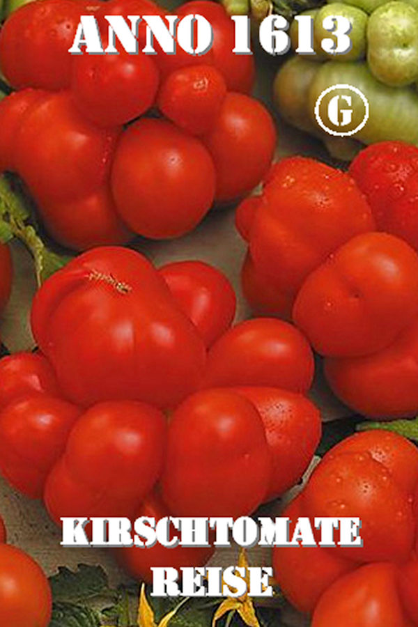 Diese historische Tomate hat rote Früchte, die aussehen, wie eine Gruppe von Kirschtomaten, die ineinander verschmolzen sind. Ideal für unterwegs, mit dem „guten alten Tomatengeschmack“. Sehr ertragreich. Das Entfernen der Blattachseltriebe steigert den Ertrag noch weiter. Regelmäßig flüssig nachdüngen und ausreichend von unten gießen.