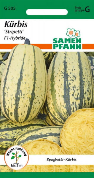 Ovaler Spaghetti-Kürbis mit ansprechender Außenfarbe, gelbgrün mit dunkleren Streifen und unregelmäßigen Maserungen. Die Fruchtform ist zylindrisch, ca. 15 x 25 cm, ca. 2 kg schwer. Das Fruchtfleisch ist hellgelb und hat lange Fasern. Wird im Ganzen gekocht (vorher mehrfach anstechen), dann halbieren, Kerngehäuse entfernen und die feinen Fasern wie Spaghetti mit der Gabel heraus holen.