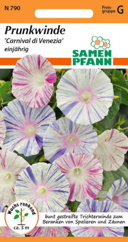 Bei der Trichterwinde ist der Name Programm. Sie windet sich um Rankhilfen, die ihr zur Verfügung gestellt werden, und verschönert diese durch ihre prunkvollen, trichterförmigen Blüten. Die Sorte Carnival di Venezia zeichnet sich durch ihre bunt-gestreiften (weiß, rosa und blau) Blüten aus, was sie noch anschaulicher macht.