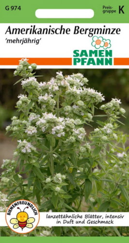 Die Amerikanische Bergminze zeichnet sich durch einen intensiven Duft und Geschmack aus. Sie ist mehrjährig, wächst aufrecht und wird bis zu 1,20 m hoch. Ihre weißlichen Blüten locken Bienen und Schmetterlinge an. Gedeiht im Beet (Vorsicht, verwurzelt sehr stark) oder auf dem Balkon im Topf oder Kasten.