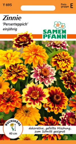Einjährige Sommerblume. Perserteppich ist eine kleinblumige, gefüllte Zinnien Mischung. Für Beete, Rabatten und sehr gut zum Schnitt geeignet. Lange haltbar in der Vase.Wuchshöhe 40 cm.