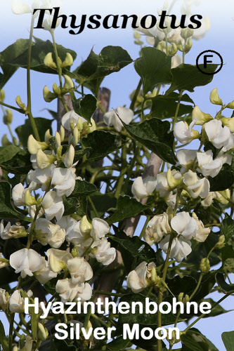 Zauberhafte Blüten in schneeweiß mit tief dunkelgrünen Bohnenschoten ergeben einen echten Blickfang an jeder Rankhilfe im Wintergarten oder im Garten. Anwendung für dekorative Zwecke oder in der Medizin zur Blutbestimmung. Nicht essbar.