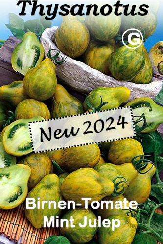 Eine neue birnenförmige, chartreuse grün gestreifte gelbe Tomate mit einem süßen und fruchtigen Geschmack. Ein Hauch von Säure, aber süß. Sie produziert sehr ertragreich Früchte von 25 bis 35 Gramm Einzelgewicht. Samenfeste Sorte. Das Entfernen der Blattachseltriebe steigert den Ertrag. Regelmäßig flüssig nachdüngen, ausreichend von unten gießen.