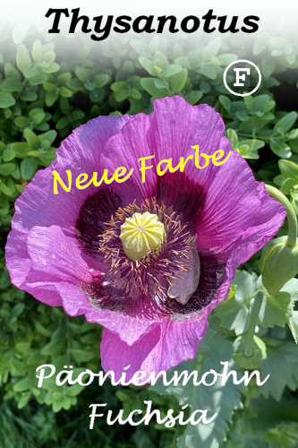 Eindrucksvoller Mohn mit einer imposanten Farbkombination aus Fuchsia mit 4 dunkelvioletten Tupfen in der Blütenmitte. Die Pollen sind beeindruckend weiß. Ein Blickfang in jedem Garten. In großen Töpfen auf der Terrasse oder im Beet eine magische Erscheinung.