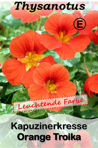Leuchtend orangefarbene Blüten über grün-weiß panaschierten Blättern. Mittellang rankende Kapuzinerkresse, sehr gut als Bodendecker und in Balkonkästen, hängend. Ein Augen- und Gaumenschmaus in Blütensalaten.