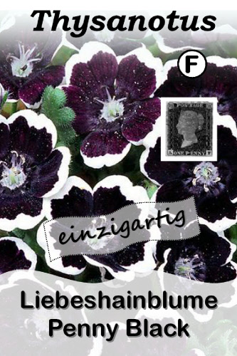 Einzigartige pfenniggroße schwarze Blüten mit weißem Saum und sehr feines Laub. Die Sorte wurde nach der alten englischen Briefmarke „Penny Black“ benannt. Freilandaussaat empfehlenswert. Polsterbildend.