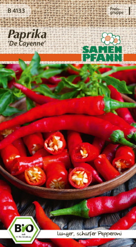 Scharfe Chili mit 10-12 cm langen, schlanken, grünen, rot abreifenden Früchten. Relativ hochwachsend, robust und Ertragreich. Schärfegrad: 6 auf einer Skala von 0 (mild) bis 10 (extrem scharf). Auch für Anbau in Töpfen auf Balkon und Terrasse geeignet.