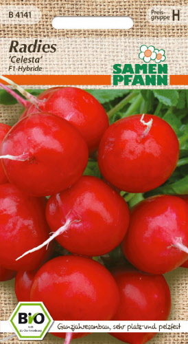 Radies mit kurzem, sehr festem und aufrecht wachsenden Laub für den kalten Anbau unter Glas und die gesamte Freilandsaison. Runde Knollenform mit feinem Wurzelansatz, sehr gute Haltbarkeit von Knolle und Laub. Celesta ist sehr platzfest bei kalten und nassen Bedingungen und sehr pelzfest im Sommer. Hohe Widerstandskraft gegen Mehltau.