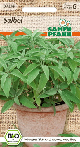Salbei ist ein mehrjähriges Heil- und Würzkraut. Verwendung frisch oder getrocknet zu Fleisch, Fisch, Suppen und Soßen. Als Tee gegen Infekte der Mund- und Rachenhöhle, entzündungshemmend, beruhigend und krampflösend. Stark würziger, aromatischer Geschmack, sparsam verwenden.