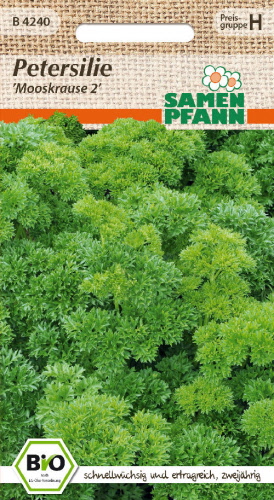 Zweijähriges Würz- und Heilkraut, dunkelgrün, dicht gefüllt und fein gekraust. Zum Garnieren und Würzen, eignet sich zum Einfrieren.