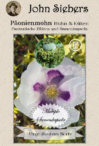 Papaver paeoniflorum Ein alter, einfach blühender kurioser Päonienmohn mit zauberhaft schneeweißen, in der Mitte violett gezeichneten Blüten. Die großen Samenkapseln werden von vielen kleinen Samenkapseln umringt. Sehr dekorativ im Beet und zum Trocknen. Blütengröße 6-7 cm.