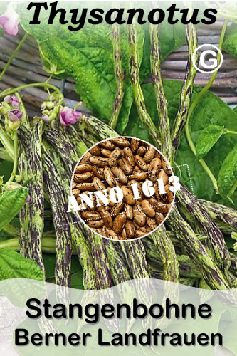 Phaseolus vulgaris. Die alte Schweizer Stangenbohne, die auch als Alphorn bekannt ist mit intensiv marmorierten Schoten von unvergleichlich gutem Geschmack. Kultur an Rankhilfen im Gemüsegarten, sehr wüchsig und ertragreich. Bohnen immer nur gekocht verwenden.