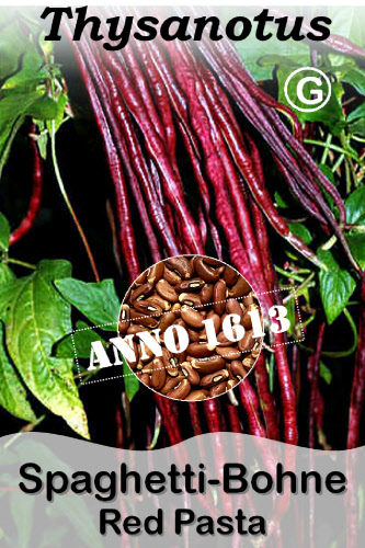 Vigna unguiculata. Eine seltene alte Kletterpflanze mit schier unglaublichen, dünnen und 70 cm langen, roten Stangenbohnen. Kultur an einer Rankhilfe im Gewächshaus, Wintergarten oder in warmer, geschützter sonniger Lage im Freien. Bohnen immer nur gekocht verwenden.
