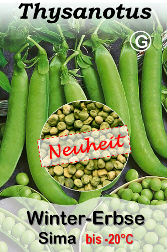Pisum sativum. Eine sehr frostfeste kompakte, 60-70 cm hohe süße Erbse für die Herbst- und Wintersaat, schneebeständig bis -20°C, markige Körner, dunkelgrün, Zwillingshülsen 6-7 cm lang, gefriergeeignet, frühere Ernte im Vergleich zur Frühjahresaussaat. Sehr kälteresistent.