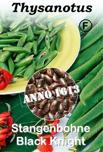 Phaseolus coccineus. Diese ursprüngliche, köstliche alte Sorte von Edmund Knight, Bischof von Shrewsbury, wird jung in fadenfreien, langen und breiten Zuckerschoten gegessen. Die dekorativen, leuchtend rosa Blüten bringen grüne Bohnenschoten mit ausgezeichnetem Geschmack und fast schwarze, violett gesprenkelte Samenkerne hervor. Kräftiger Wuchs, bis 3 m Höhe.