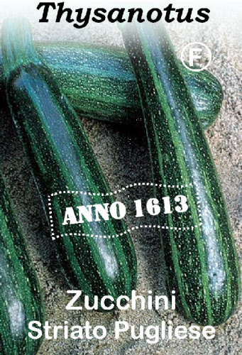Cucurbita pepo. Eine robuste Sorte, die früh und sicher Früchte ansetzt, auch bei feucht kühlem Wetter. Sie bringt unermüdlich bis zum Frost einen hohen Ertrag an hellgrünen, kugelrunden, marmorierten Früchten. Zucchini sind sonne– und wärmeliebend und brauchen einen nährstoffreichen und feuchten Boden. Früchte regelmäßig abernten.
