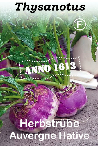 Brassica rapa. Eine sehr alte, große französische Sorte aus der Auvergne, die auch Rabitrouille genannt wird. Oben voluminöse, flache Wurzel, unten etwas wulstig. Sehr glatte Haut, hellviolett gefärbt im gesamten oberirdischen Teil, erreicht einen Ø von 15-18 cm oder mehr. Schneeweißes, zartes Fruchtfleisch.