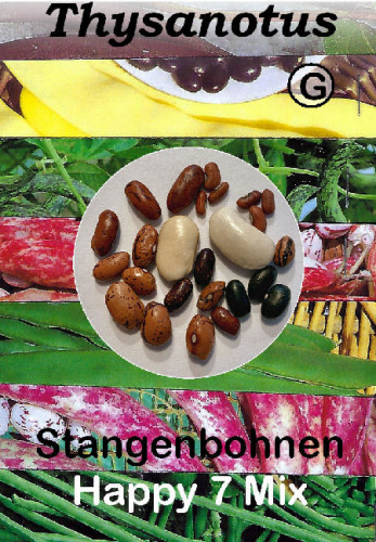 Phaseolus vulgaris. Eine Mischung aus 7 sehr unterschiedlichen Stangenbohnensorten. Die Bohnenschoten bieten eine Vielfalt in grün, rot-weiß gesprenkelt, gelb und dunkel violett mit den unterschiedlichsten Formen und alle mit einem sehr guten Bohnengeschmack. Bohnen immer nur gekocht essen.