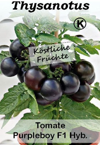 Solanum lycopersicum. Außergewöhnliche, resistente Zwergsorte für den Containeranbau, runde kirschförmige Früchte von 30 g, dunkelviolett, schöne Präsentation und guter Geschmack. Solide und kräftige Pflanze, 30 cm hoch. Anbau unter Glas und im Freiland.