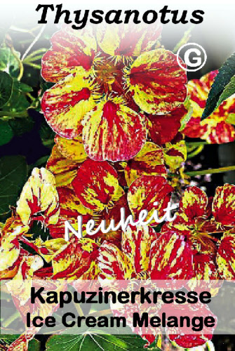Tropaeolum minus. Beeindruckende Blüten mit einem subtilen süßen und würzigen Geschmack. Die Farbe spielt von leuchtend Gelb zu kräftig Scharlachrot. Dieses Bild wandelt sich im Blütenverlauf. Schöne, 35 cm kompakte Pflanzen mit dunkelgrünen Blättern. Ein Augen– und Gaumenschmaus im Blütensalat.